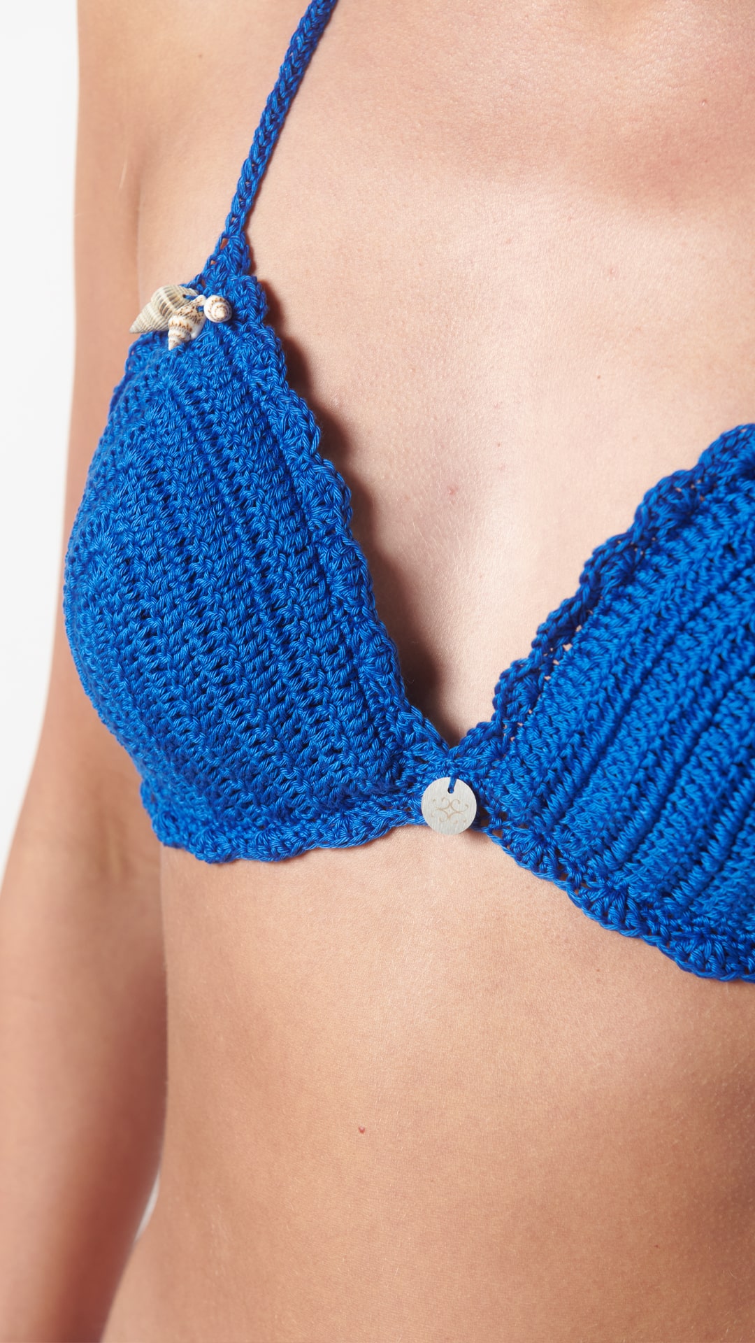 La parte superiore è interamente realizzata a mano con lavorazione a crochet con filato di cotone italiano, completata da coppe interne per un fitting naturale e raffinato.