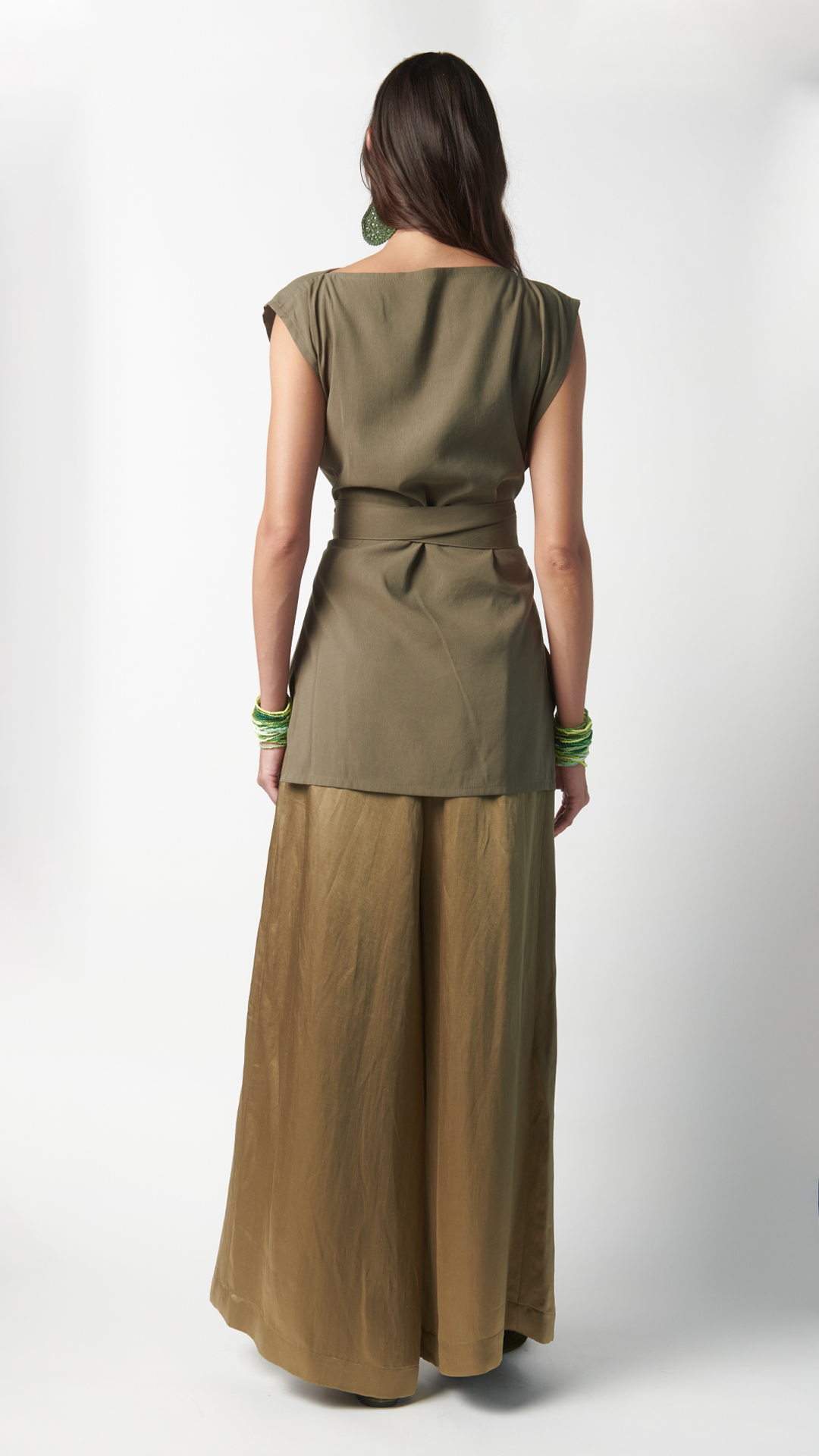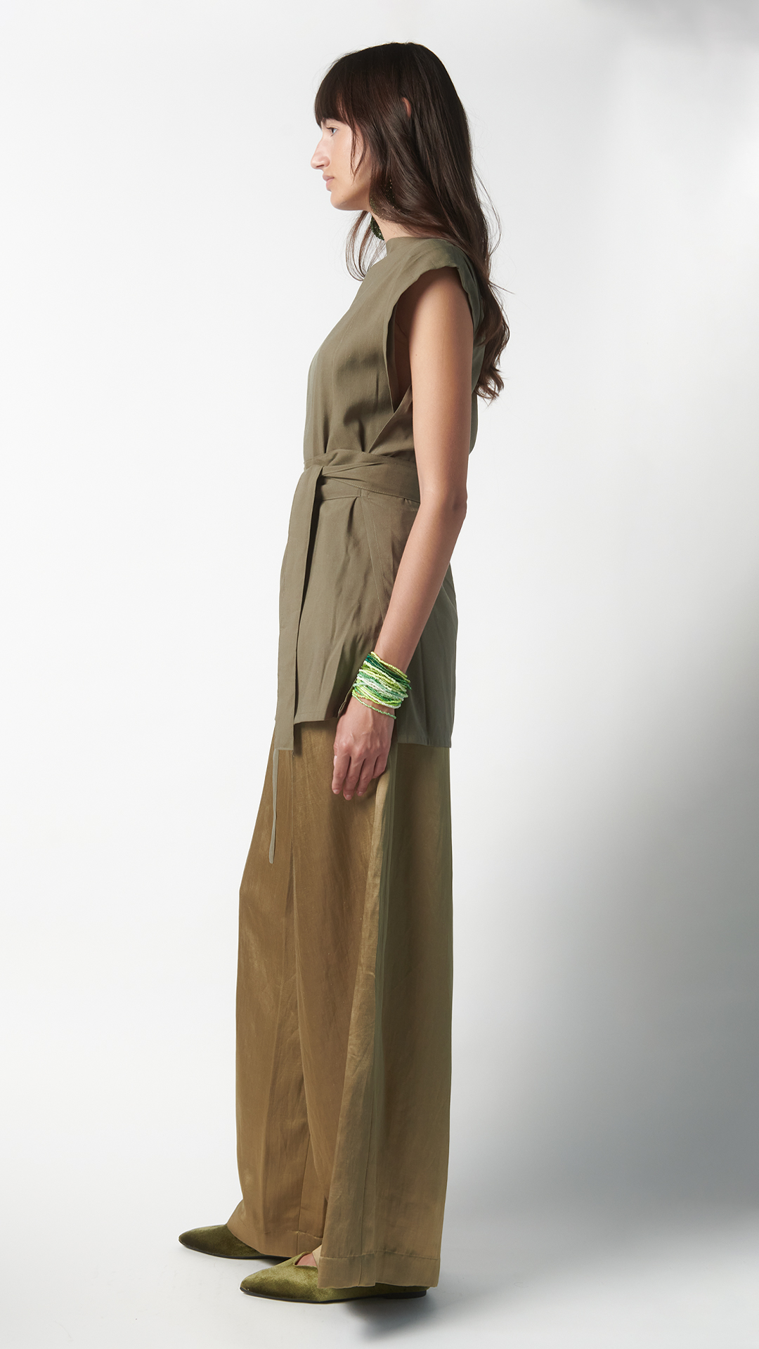 Il collo a barchetta lineare e i lunghi lacci laterali da annodare in vita creano una silhouette rilassata e sofisticata. La cintura in taffetà a contrasto aggiunge un tocco di raffinatezza, rendendo questo capo perfetto per chi desidera un look bohémien contemporaneo.
